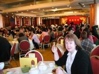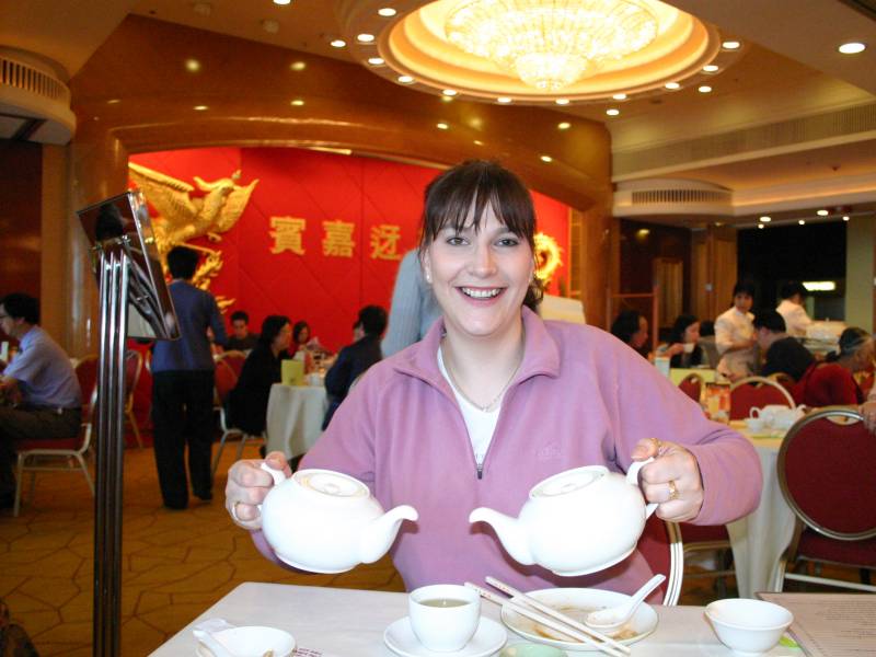 Sue wielding the tea pots at City Hall Dim Sum